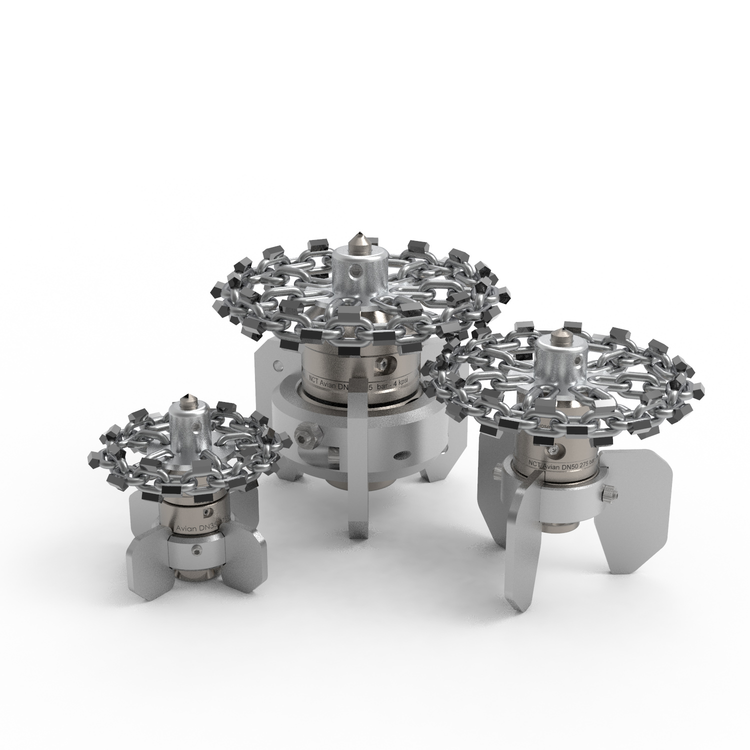 Diese Düsen sind mit Kettenschleudern mit kleinen Kettenzacken aus Widia bestückt. Diese reinigen und schleifen die Rohren auf innovative und extrem wirksame Weise.