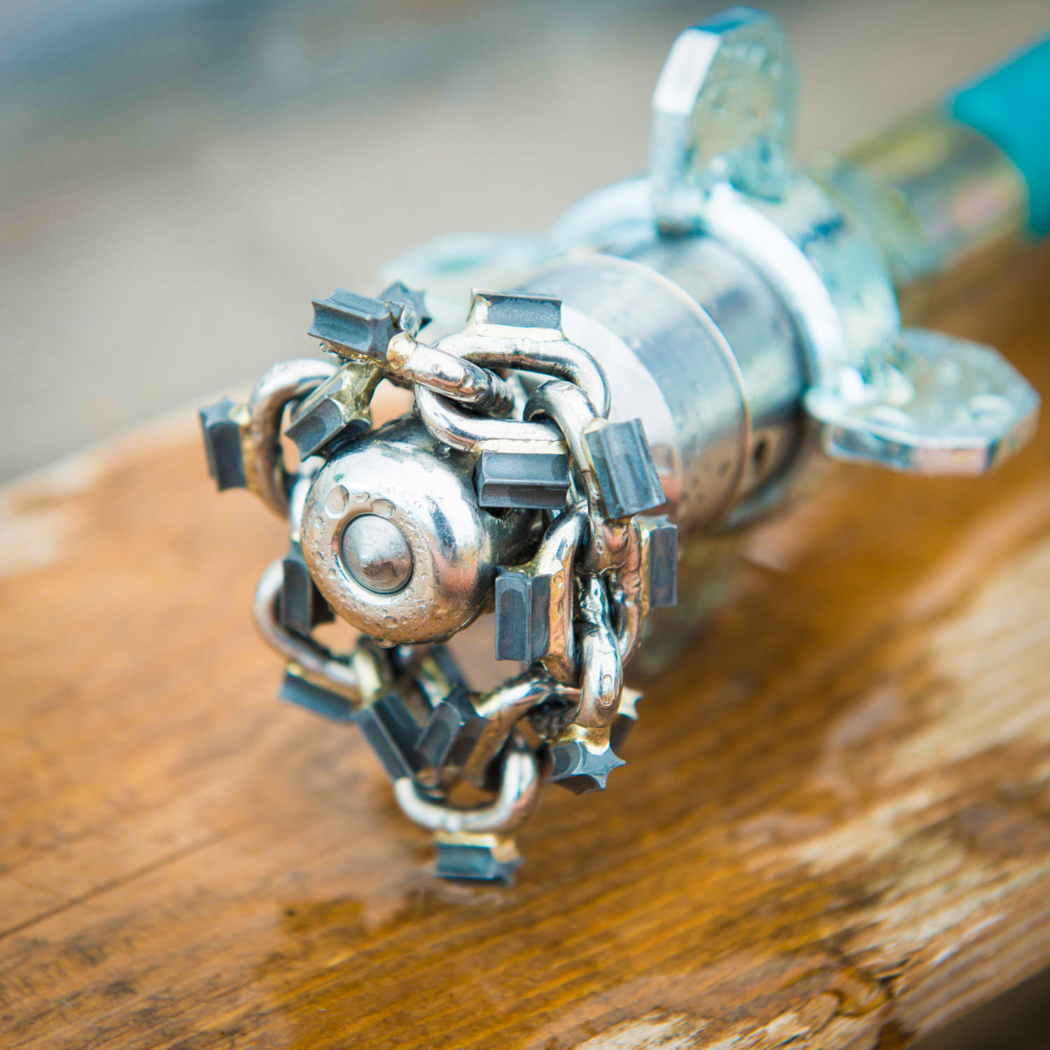 Die Kette (gleiche Abmessung wie der Rohrdurchmesser) wird auf den Düsenkopf posizioniert. Die Zacken aus Widia schleifen die Wände ab und beseitigen alle Ablagerungen oder Verstopfungen wie Wurzeln, Kalkstein und Rost.