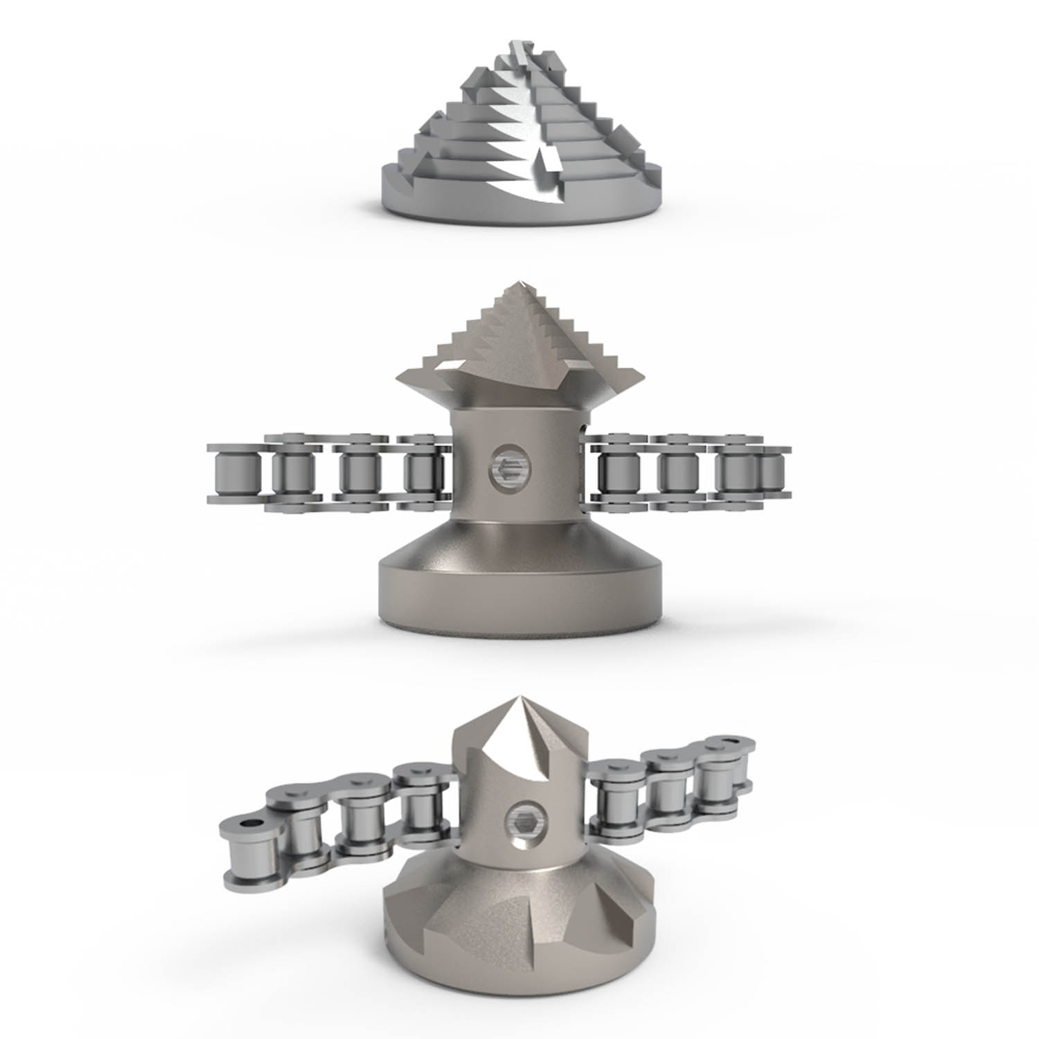 L’ugello può essere ordinato singolarmente (con testa in widia) oppure in kit, comprendente ugello, testa in widia, testa portacatene, catene e centratori.