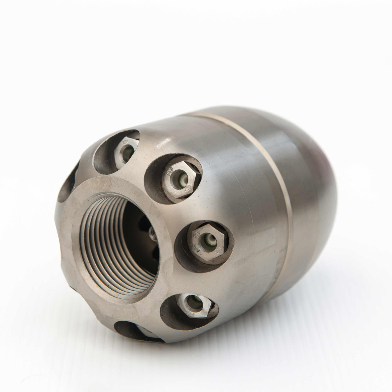 Realizzati in acciaio inox con inserti in ceramica ad alta resistenza all’usura, sono dotati di un getto frontale rotante che genera un cono d’acqua a 20°, garantendo un’ampia superficie di impatto e un’elevata capacità di sfondamento contro ostruzioni di grasso, calcare, radici, schiume o risanamenti non conformi.
