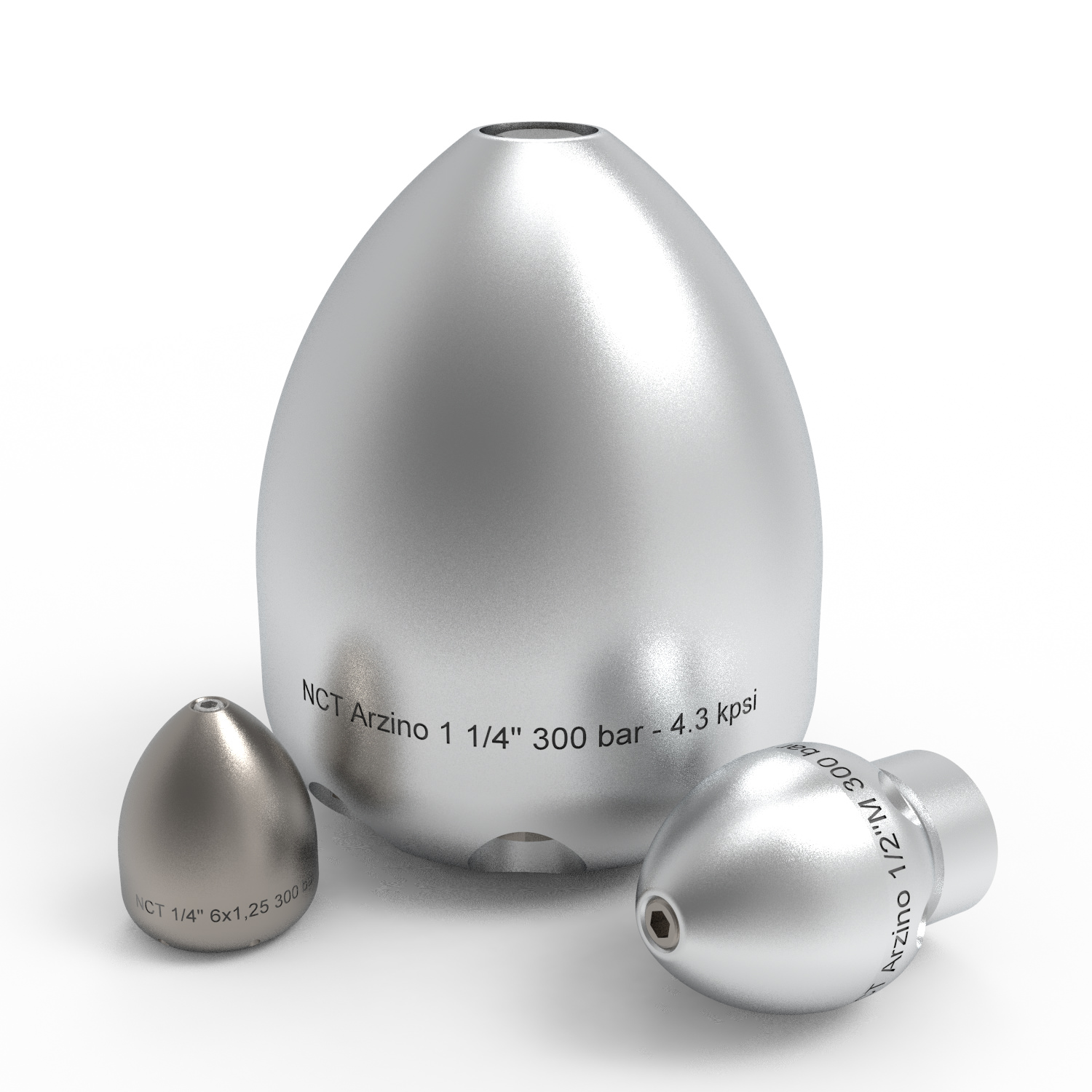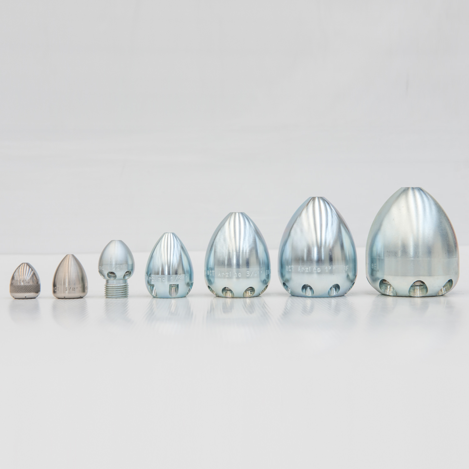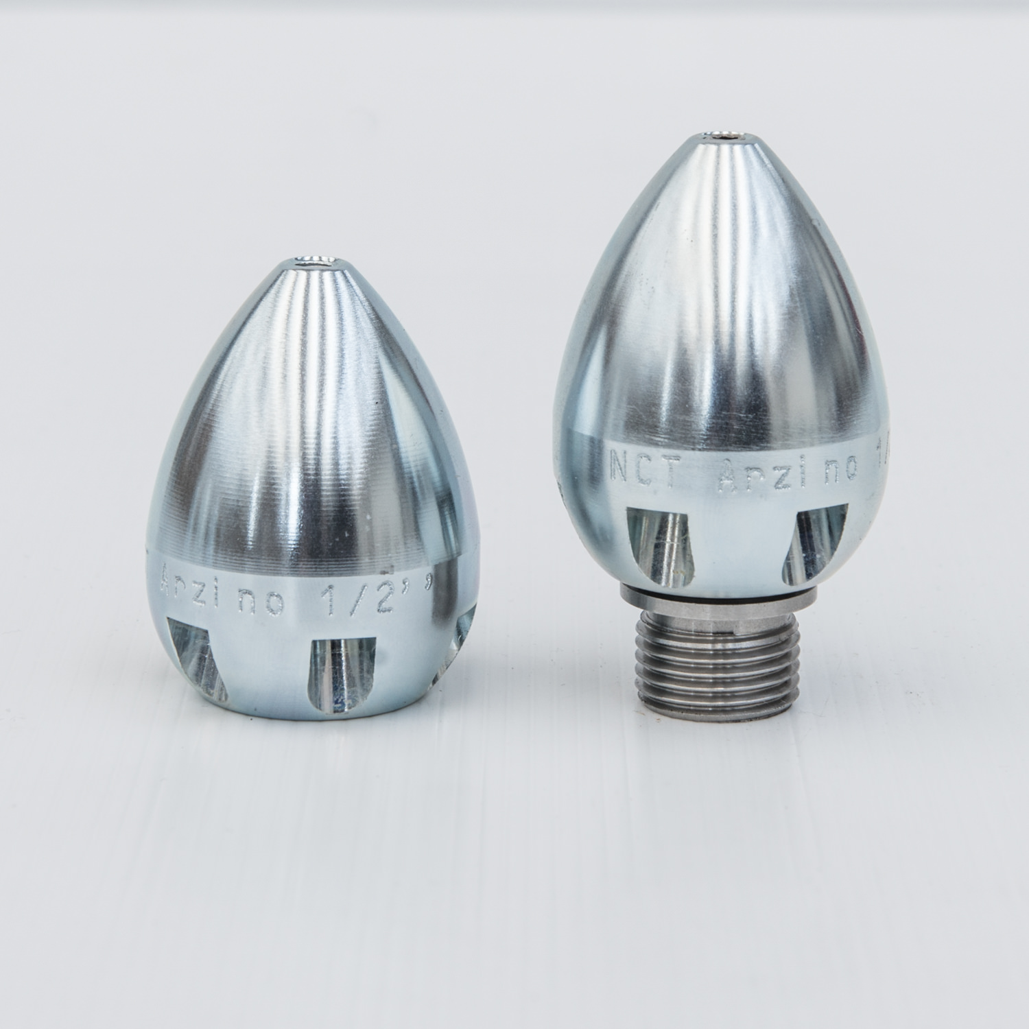 Jede Düse ist mit einer Öffnung vorne versehen, in der eine Verschlusskappe oder ein gelöcherter Einsatz (für den Vorstrahl) eingebaut werden kann. Beide Teile werden mitgeliefert.