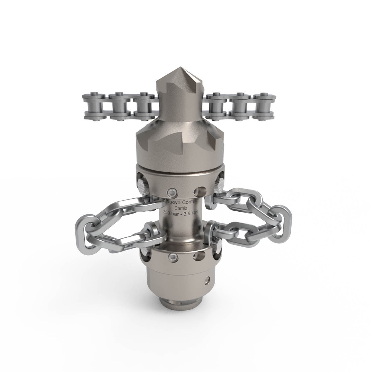 Bestellbar sowohl als Düsen-Kopf als auch mit Kunststoffkoffer mit Rundkopf und Wurzelmessern, Ketten verschiedener Größen, Inbusschlüsseln und Ketteneinsätzen.