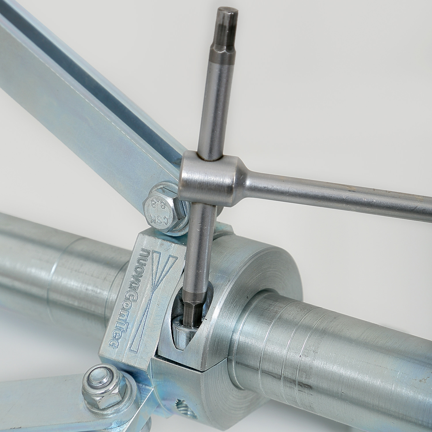 Führungskäfig mit Rädern aus Kautschuk und Sicherungsring, der auf das Hauptteil verstellt werden kann, wo die Stufen für die verschiedenen Durchmesser gekennzeicht sind.