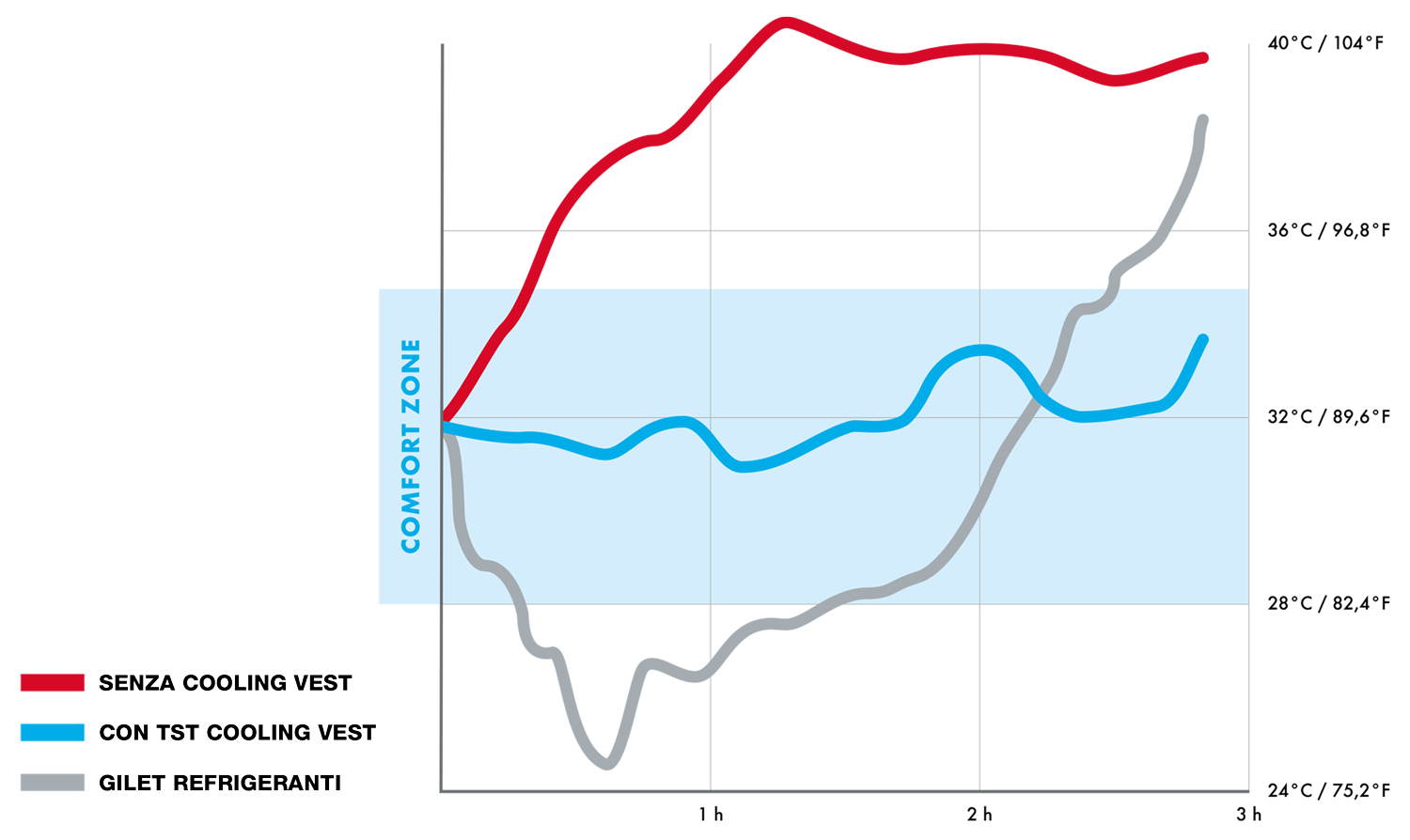 Il fatto di assorbire calore dal corpo piuttosto che raffreddarlo, ti consente di restare più a lungo nella comfort zone. La comfort zone è la condizione nella quale il tuo corpo mantiene una temperatura che ti fa sentire bene e rendere al meglio.