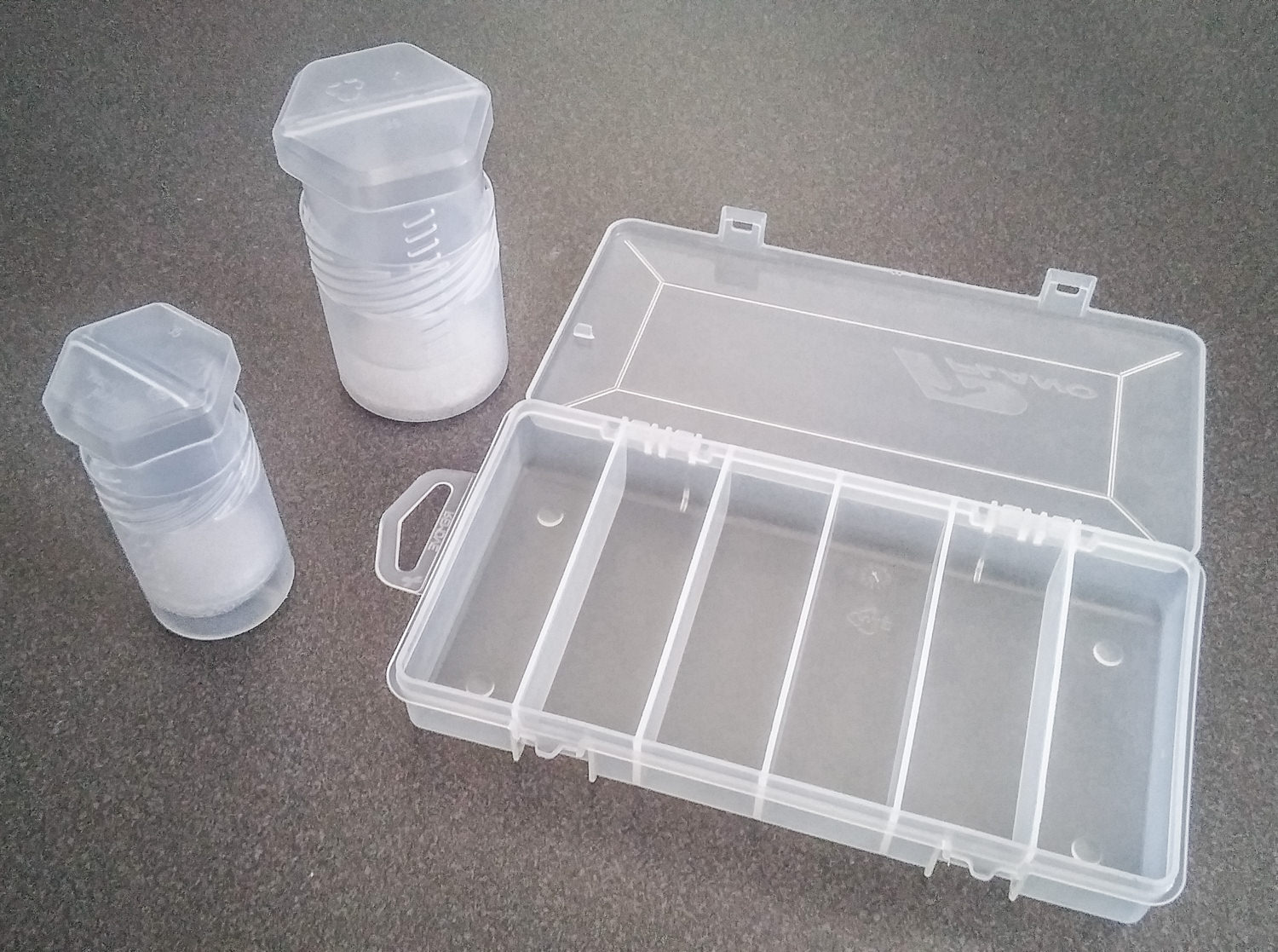 Custodie avvitabili in plastica trasparente e portaminuterie in plastica a 6 scomparti.