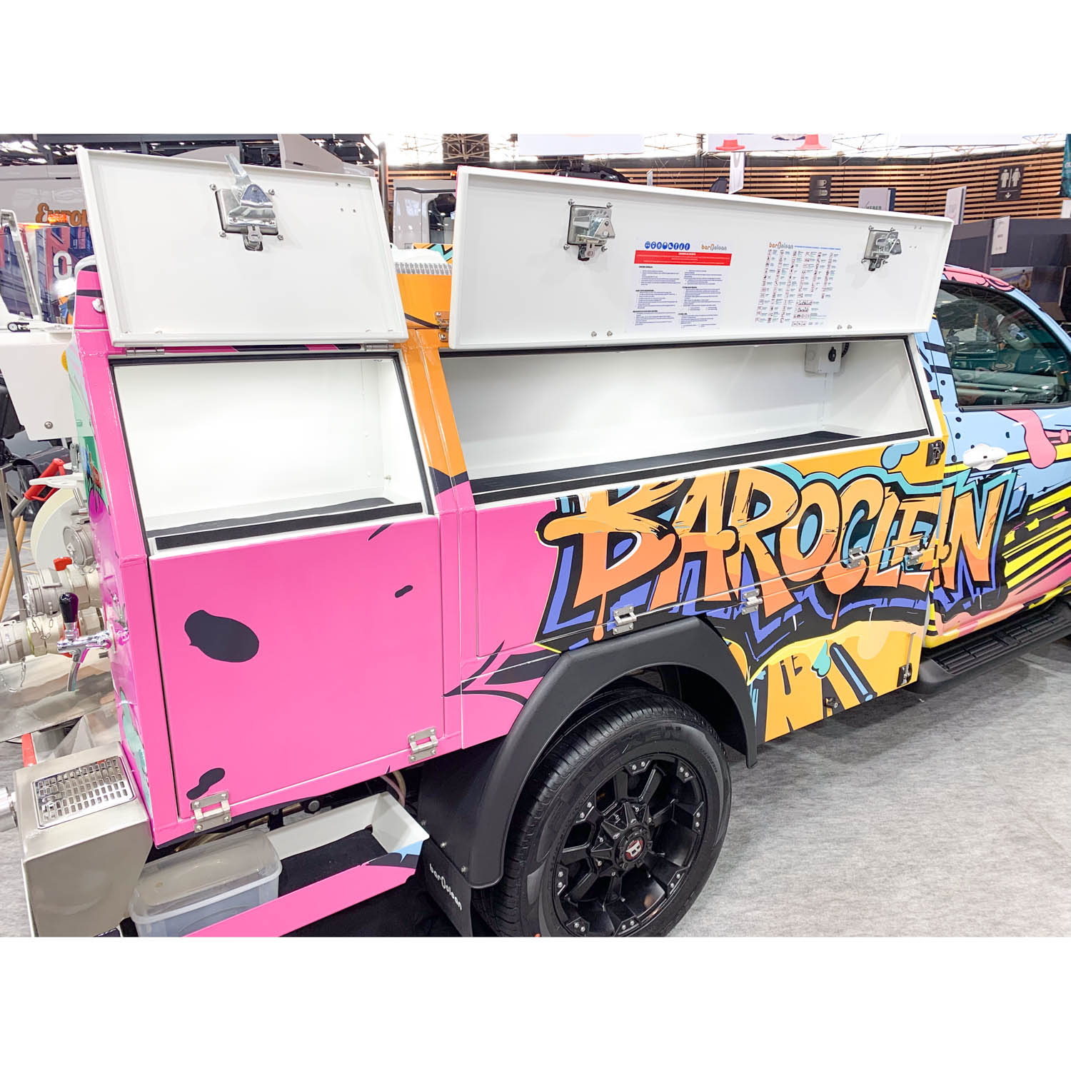 Ampi vani porta utensili con ante in alluminio e serratura sui lati della cisterna