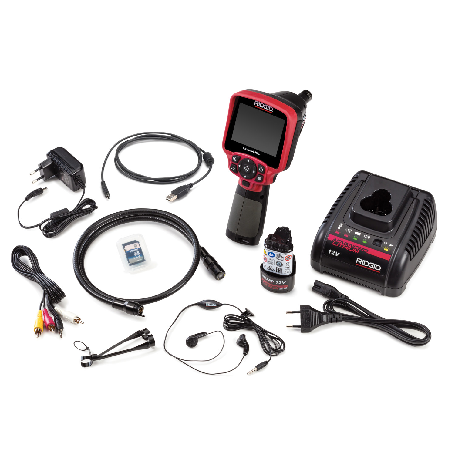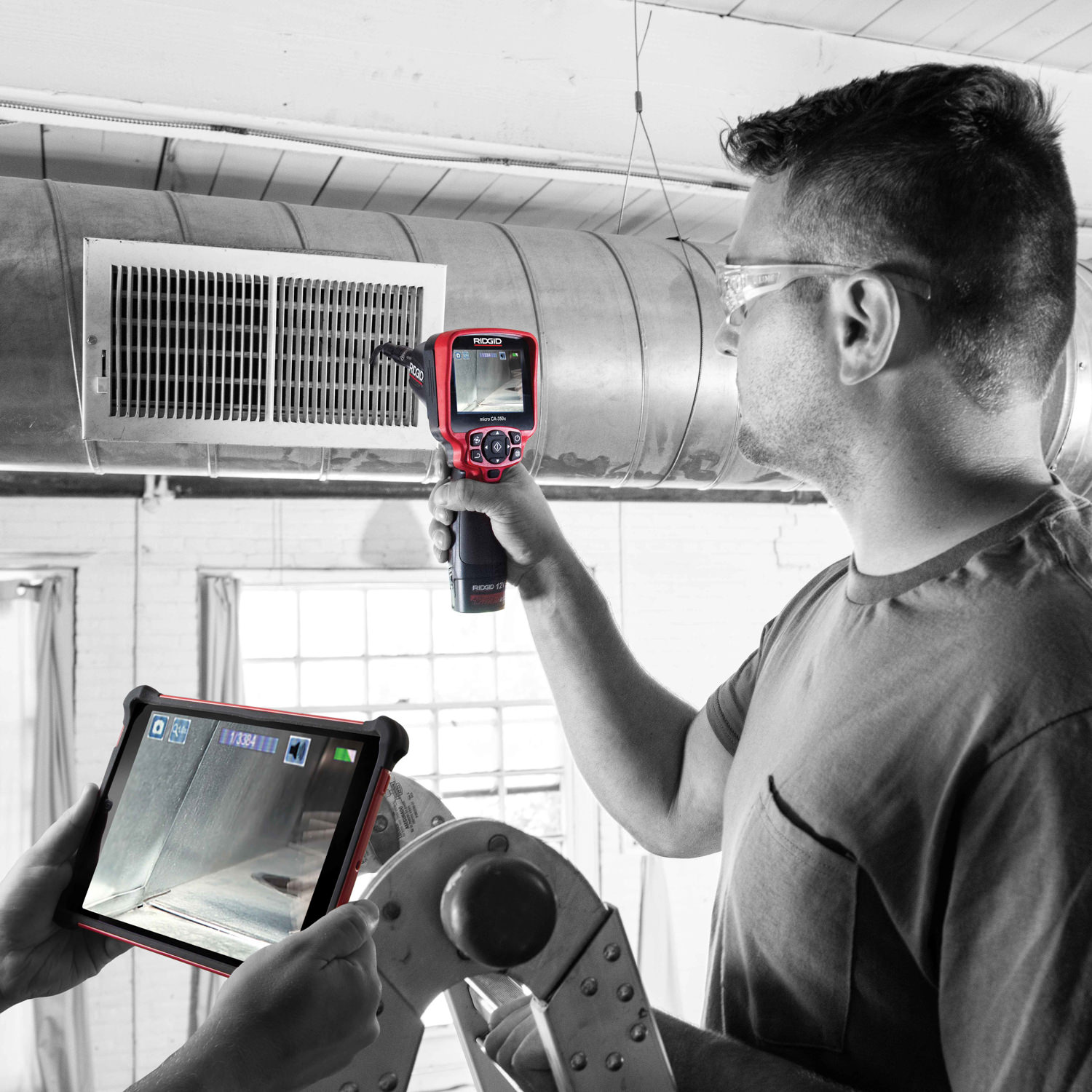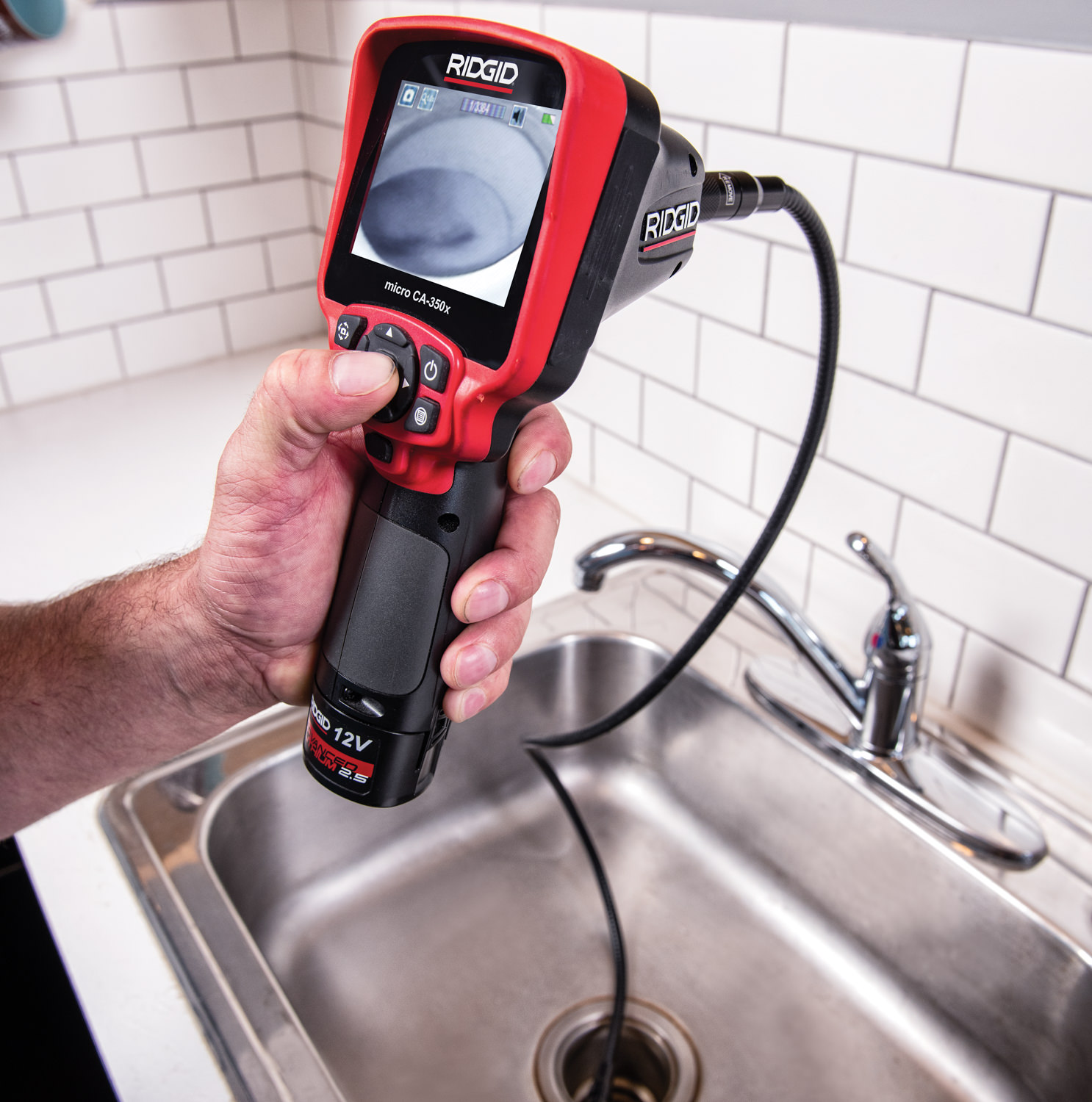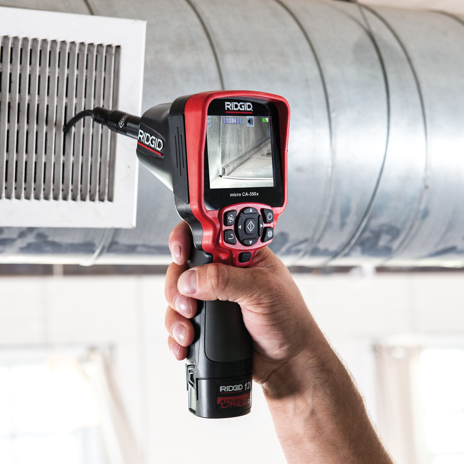 La nuova videocamera di ispezione micro CA-350x RIDGID con Wi-Fi™ e Bluetooth™ per la condivisione istantanea di immagini/video e la visualizzazione live su un secondo schermo, ora con la nuova batteria 12 V.