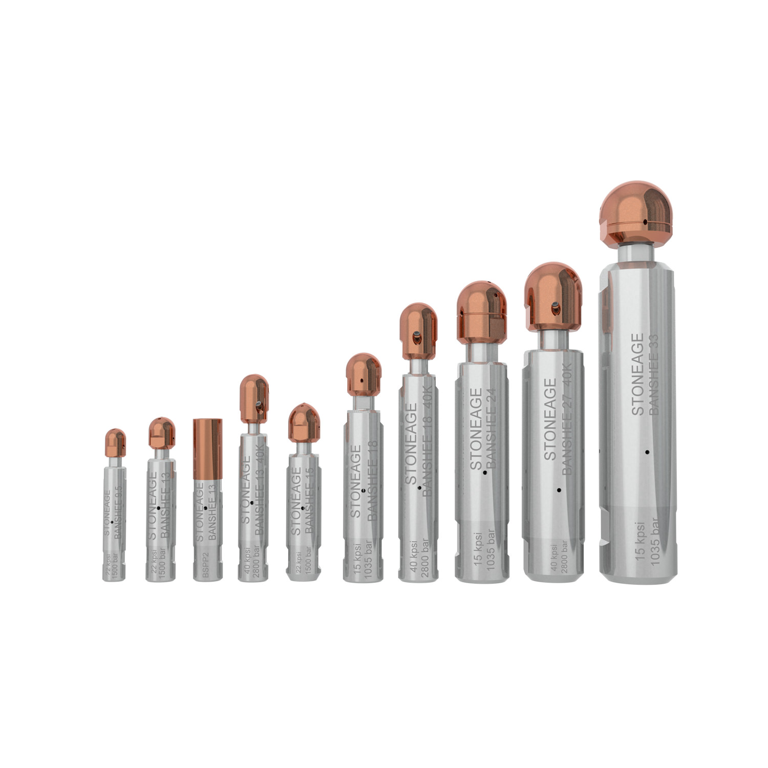 Gli ugelli Banshee si distinguono principalmente per la misura (diametro del corpo) e la pressione massima di esercizio.